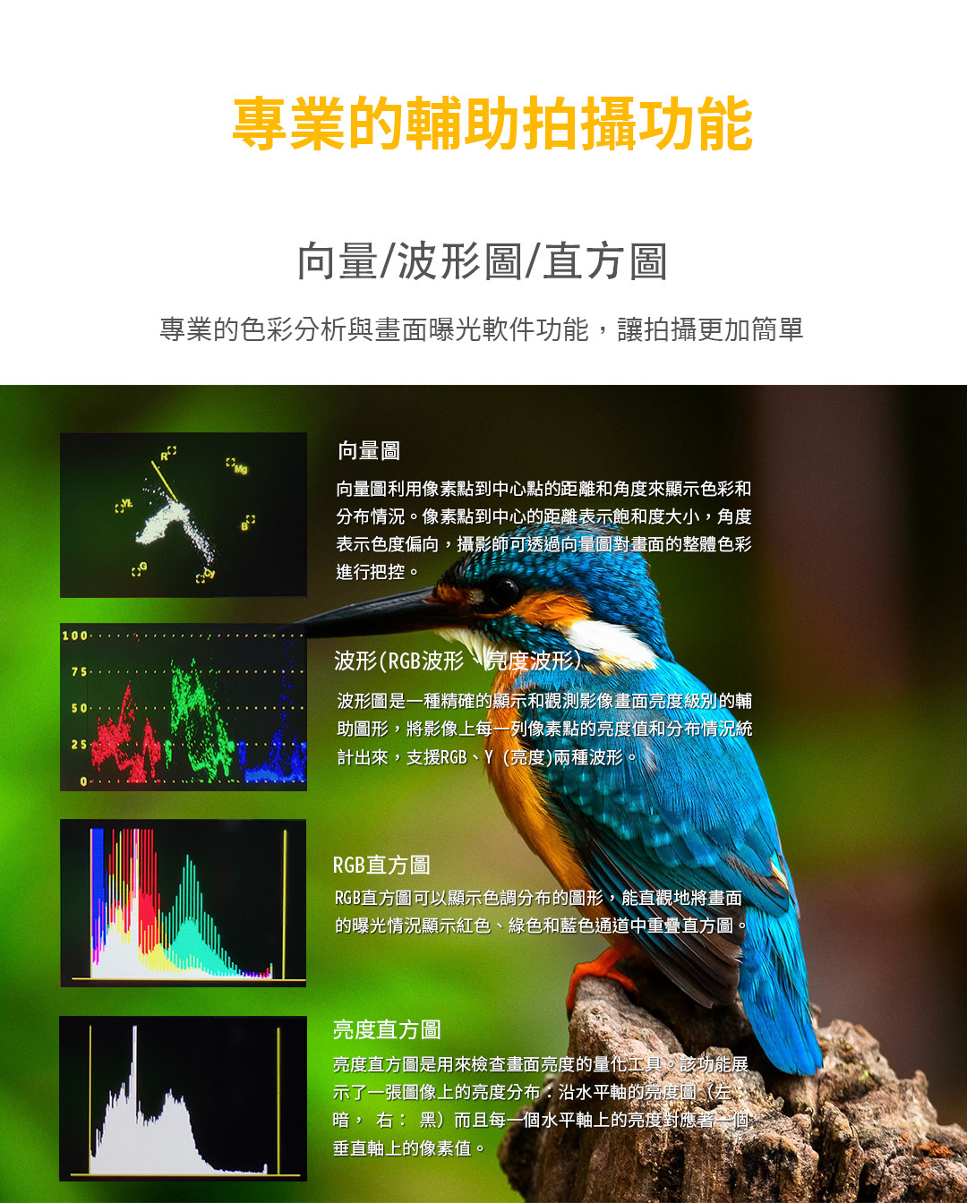 功能: 直方圖、波形、矢量示波器、所有波形、HDR、音頻表、自定義LUT